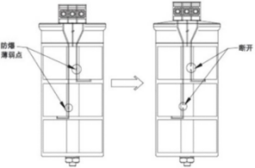 如果发生过电压或临近电容器不断增加的“自愈式”破坏,将导致电容器内部压力增加,为了防止突然发生破裂,必须要在电容器的圆柱铝罐上设计一个“压力释放结构”。这个安全的结构是位于电容器内部连接的一个被削弱的点。通过拉开有褶的部分来向外推起电容器的顶部,达到释放压力的目的。与顶部连接的金属导线也因为顶部的上升而被拉断,有效的阻碍了电流的流过,防止电容器因过载及过热而引起爆炸。
