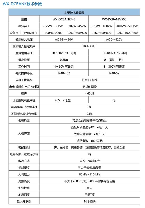 WX-DCBANK系列电压暂降治理装置,是基于直流配电和现代储 能技术,采用并联冗余供电方式,对交流电网发生电压暂降和短时中 断事件进行预防和治理,保障敏感负荷连续正常运行的设备。在交流 电网正常时,被保障的敏感负荷由交流供电带负载运行,治理装置处 于热备用状态;当交流电网发生电压暂降或短时中断时,治理设备以微 秒的速度立即切入工作状态替代交流电网对敏感负荷进行持续供电, 从而保障其不间断运行,杜绝生产安全事故和次废品的产生。本装置 特别适用于变频驱动的功率负载。
