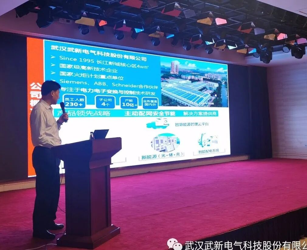 董事长杜小刚在研讨会上介绍了武新电气在2010年就在新能源光伏领域不断探索,积累了丰富的经验,从项目开始开发、建设与运维,积累了多年经验,并开发了新能源光伏在线监测系统。武新除了深耕光伏,也在积极探索无功补偿、储能、配网售电多能互补能源开发和建设,构建一体化智慧能源互联发展模式。武新电气立足智能化升级,提出水电气综合能源管理发展战略,是新能源科技产品和服务一体化专业供应商。武新电气希望与地方政府、电网公司开展更多合作,建立高校园区、商业园区、工业园区等,采用数字化基础+智能化手段,给客户提供更安全、更智能的能源解决方案。