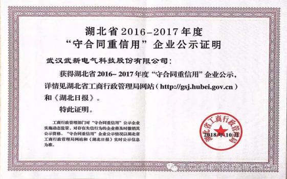 武汉武新电气科技股份有限公司获得湖北省2016-2017年度”守合同重信用“企业公示!